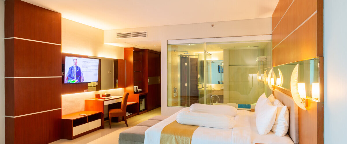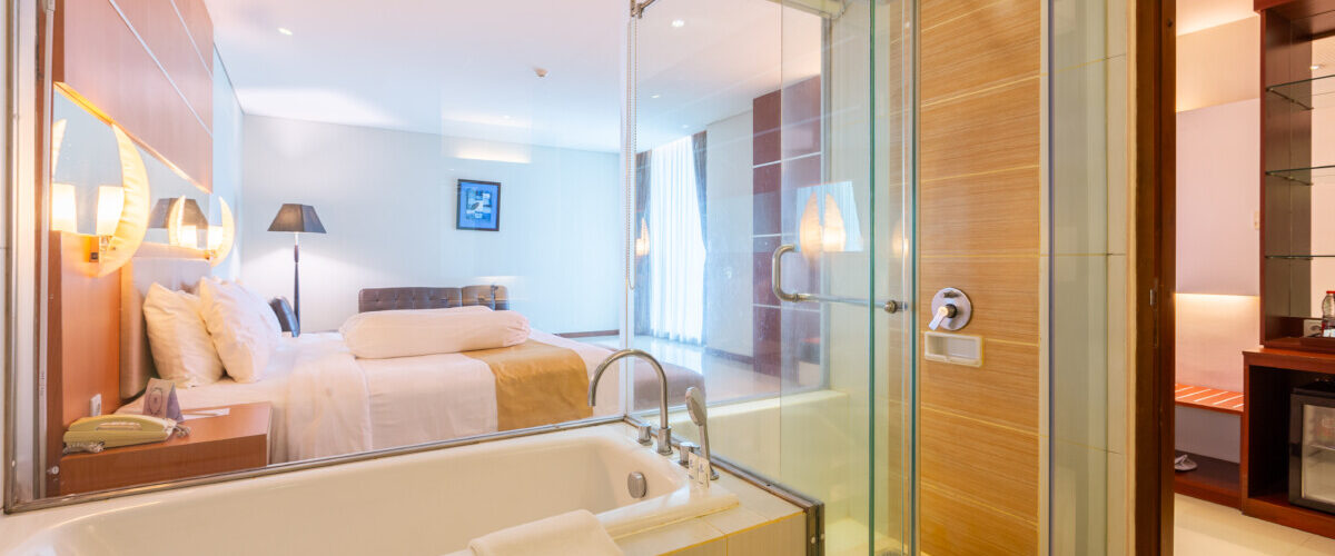 Deluxe Premiere seluas 46 m² tersedia dengan King Bed dan dilengkapi dengan area duduk, TV LED satelit 45”, Wi-Fi berkecepatan tinggi, brankas, air mineral, kulkas mini dengan camilan dan minuman non-alkohol gratis, fasilitas kopi & teh, pengering rambut, perlengkapan mandi, serta kamar mandi dengan bathtub dan shower terpisah.