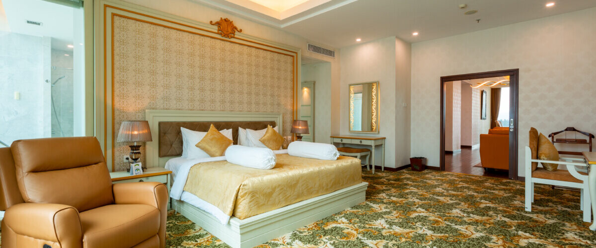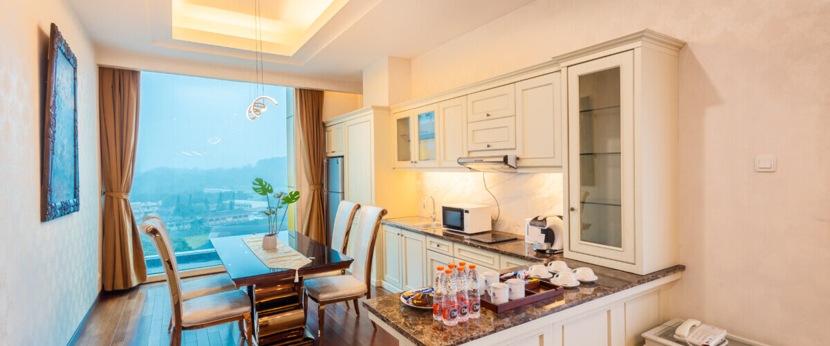 The Presidential Suite features relaxing living and dining room equipped with wide-ranging kitchen set facilities, 60″ Smart LED TV, Home Theater, High Speed Wi-Fi Internet, Mineral Water, Mini Fridge with Complimentary Snacks and Non-Alcoholic Drink, Coffee & Tea Facilities, Coffee Maker, Hairdryer, and Separate Bathtub & Shower Room.